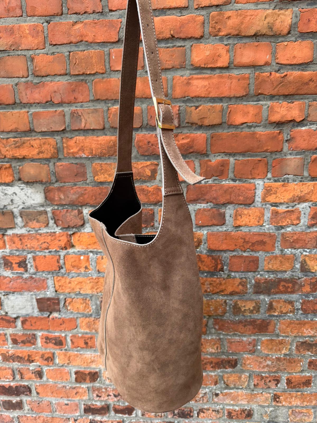 Uitgevoerd in hoogwaardig suède in een verfijnde, neutrale taupe kleur. De zachte textuur van het suède geeft de tas een luxe en warme uitstraling.